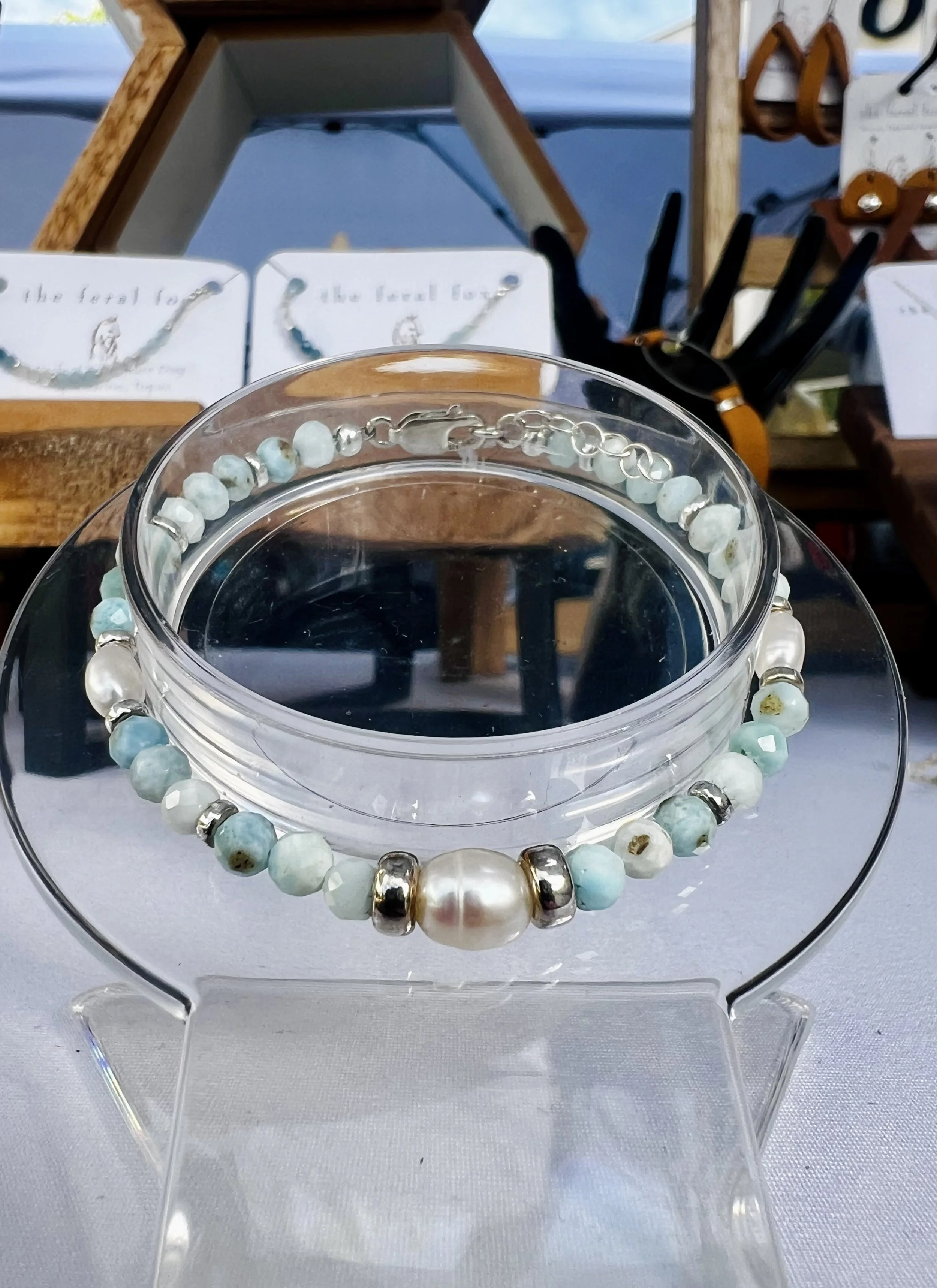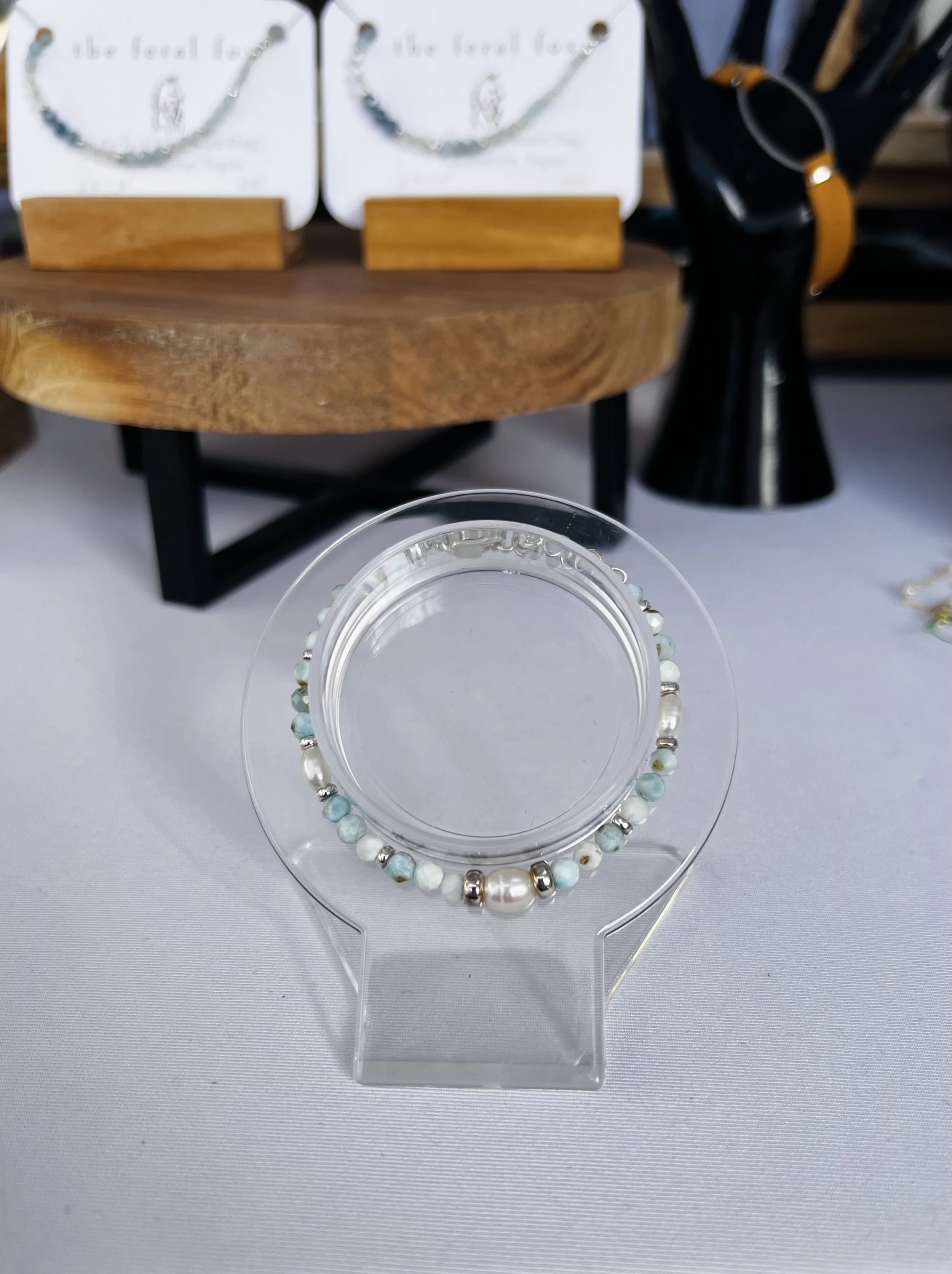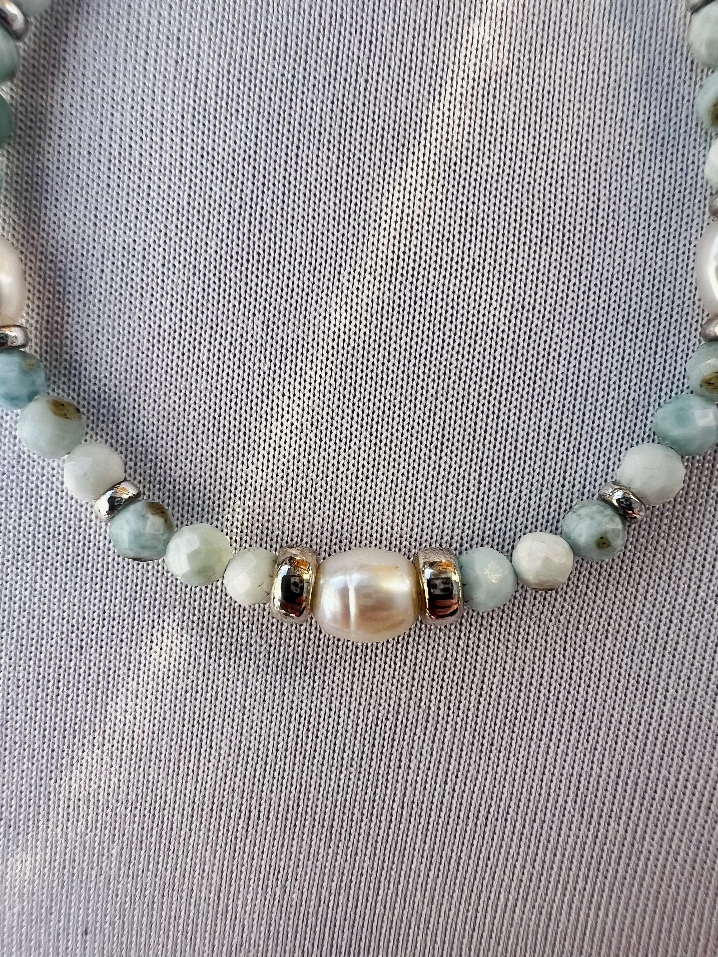 Drift away to ocean shores with this serene and elegant bracelet. Cool, sky-blue Larimar gemstones- known as the Stone of the Caribbean- evoke the calm, crystal waters of a tropical escape. Nestled between them, three lustrous Freshwater Pearls shimmer like sunlight on gentle waves.